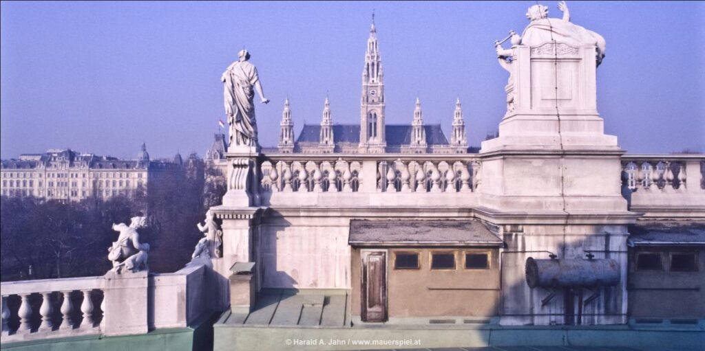 Zuletzt erforsche ich die Lüftungsanlage: Hightech der Gründerzeit. Ein riesiger Lüftungskanal führt vom Volksgarten ins „Haus am Ring“ , die Luft strömt gleichmäßig durch den Zuschauerraum und entweicht an der höchsten Stelle des Daches. Der weithin sichtbare „Blasengel“ dreht sich dort mit dem Wind, und bei der Gelegenheit entdecke ich noch ein skurriles Detail: Hinter den stolzen Figuren der Ringstraßenfassade verbergen sich Umkleidekabinen fürs Sonnenbad der Hausarbeiter!