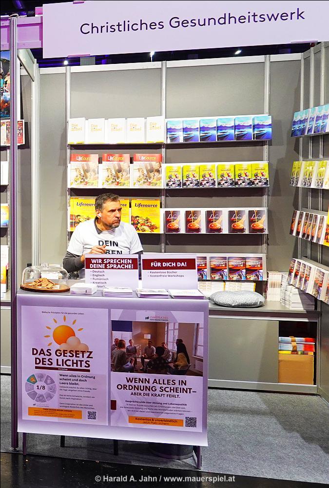 Neben den Platzhirschen gibt es eine seltsame Gruppe von Spezialverlagen, hier wähnt man sich auf der Esoterikmesse, hat die Ahmadiyya Muslim Jamaat ihre Koje neben dem Christlichen Gesundheitswerk, nur getrennt durch „Happy Science“ (mit Wissenschaft haben die lächelnden Asiaten aber wohl wenig zu tun). Hier steht die Drückerkolonne wie vor einer venezianischen Pizzeria und zieht die Messebesucher in Gespräche – die meisten nehmen deshalb lieber die nächste Gasse. Auch sonst Skurrilitäten: „Fleisch“, eigentlich ein Gesellschaftsmagazin, erhielt den Stand zwischen Kochbox und Espressomobil, offensichtlich in Verkennung des Themas.