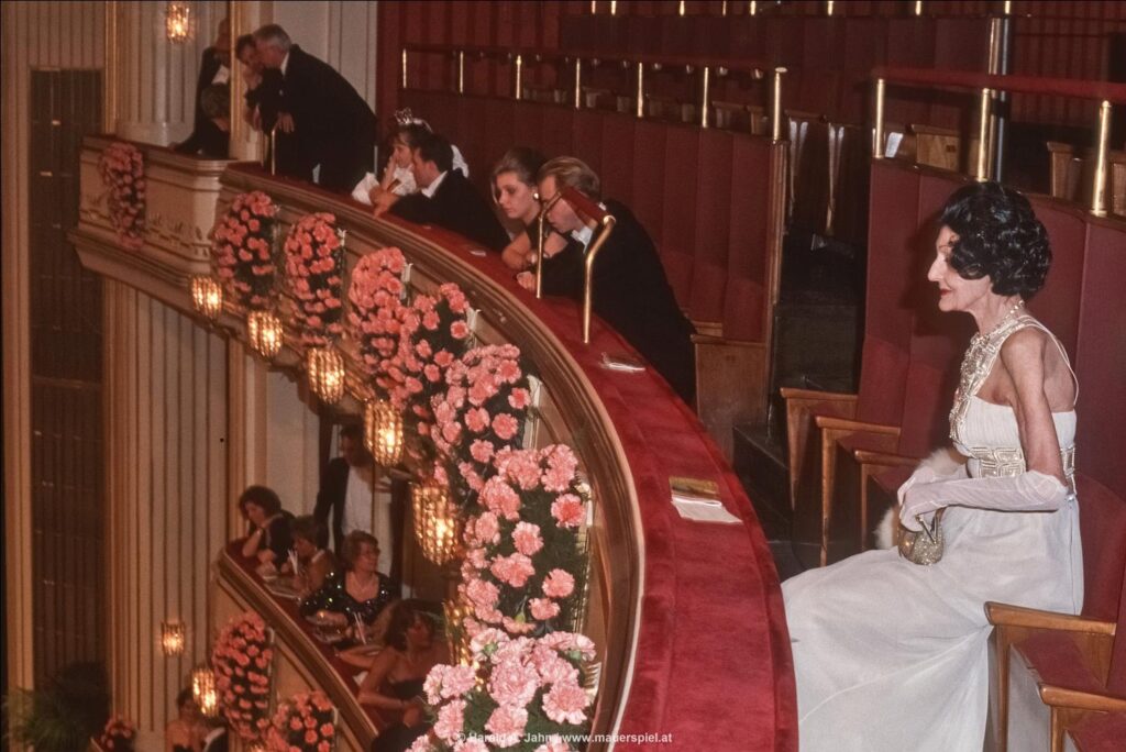 Im obersten Rang dann die Zaungäste: Es gibt (oder gab?) eine Zuschauergalerie, deren Besucher bei geringen Eintrittpreisen vom eigentlichen Ball ausgeschlossen waren. Und hier traf ich auch die mondänste Erscheinung des Abends: Eine kleine Dame, wie aus der Zeit gefallen, beobachtete fast regungslos das Fest 20 Meter unter ihrem Platz. Sie war in ihrer bescheidenen Zerbrechlichkeit die eleganteste Besucherin des Opernballs, ausgerechnet in dem Jahr, in dem Richard Lugner seinen peinlichen Stargast-Unfug begann.