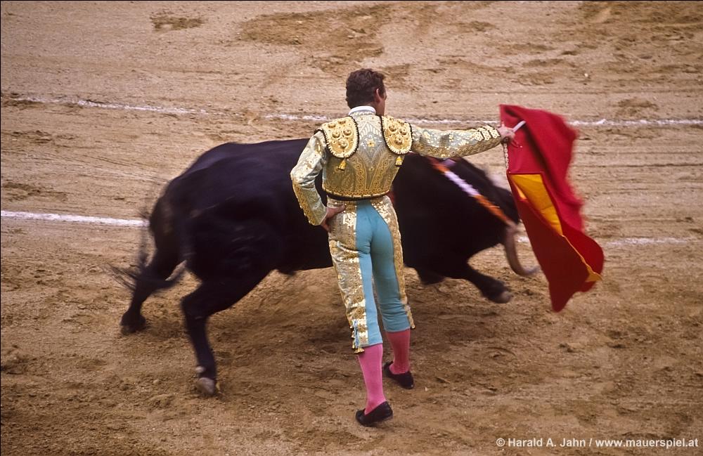 Ich denke, jedes Land leistet sich irgendeine Unvernunft – die Niederlande das freie Haschischrauchen, Deutschland die Autobahnraserei und Spanien den Stierkampf, eine für den korrekten Mitteleuropäer brachiale Veranstaltung. Vor Jahren war ich in Madrid aber ausreichend neugierig, das archaische Spektakel zu besuchen. Die Show beginnt mit dem Einzug der Gladiatoren, begleitet von ohrenbetäubenden Fanfaren aus Trompeten, die in Spanien immer etwas falsch gestimmt klingen. Tatsächlich folgte dann ein widerliches Gemetzel. Beim Fußball muss man etliche Spiele sehen, um ein wirklich gutes Tor mitzuerleben. Beim Stierkampf ist es ähnlich, entsprechend entsetzt war ich über das jämmerliche Schauspiel, das die ersten beiden Matadore boten. Ich sehe allerlei rituelle Gesten, Gebete, Bekreuzigungen; sie agieren wie Fußballer, und wenn man die Sprache kennt hört man, dass ihre Interviews ebenso klingen. Wenn diese zarten Männer dann dem massigen Stier gegenüber stehen schneiden sie theatralische Grimassen mit ihren langen Bubengesichtern, bringen ihre Körper in angespannte, aufgeplusterte Positionen, glitzern im „Traje de luces“, dem „Anzug der Lichter“ in den Scheinwerfern: Das Kostüm ist mit Bedeutung und Symbolik aufgeladen, zur knielangen Hose gehören rosa Strümpfe, schwarze Slipper als Schuhwerk, dabei tragen sie Kappen mit seitlichen Mickymausohren. Es ist ein Fest des Machismo, obwohl mich die Arbeit der Matadores an Frauen erinnert, affig kostümiert locken und verweigern sie dem brutal-rohen Gegner die Erfüllung.